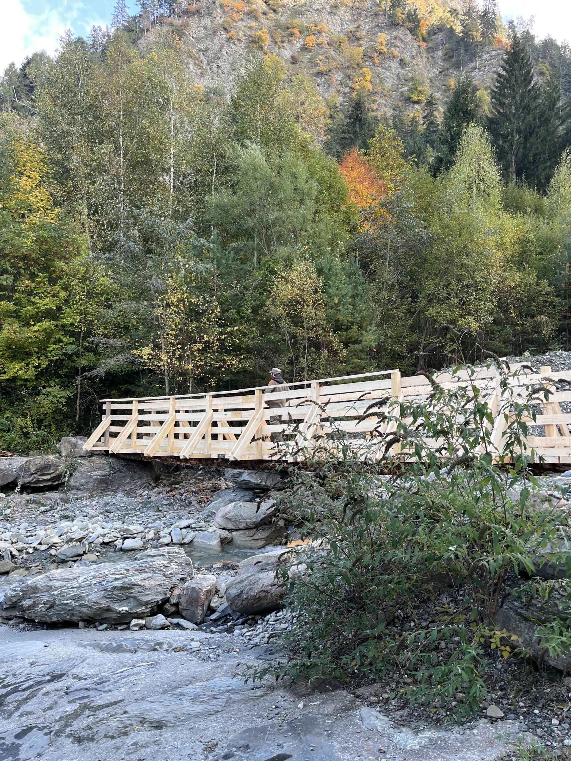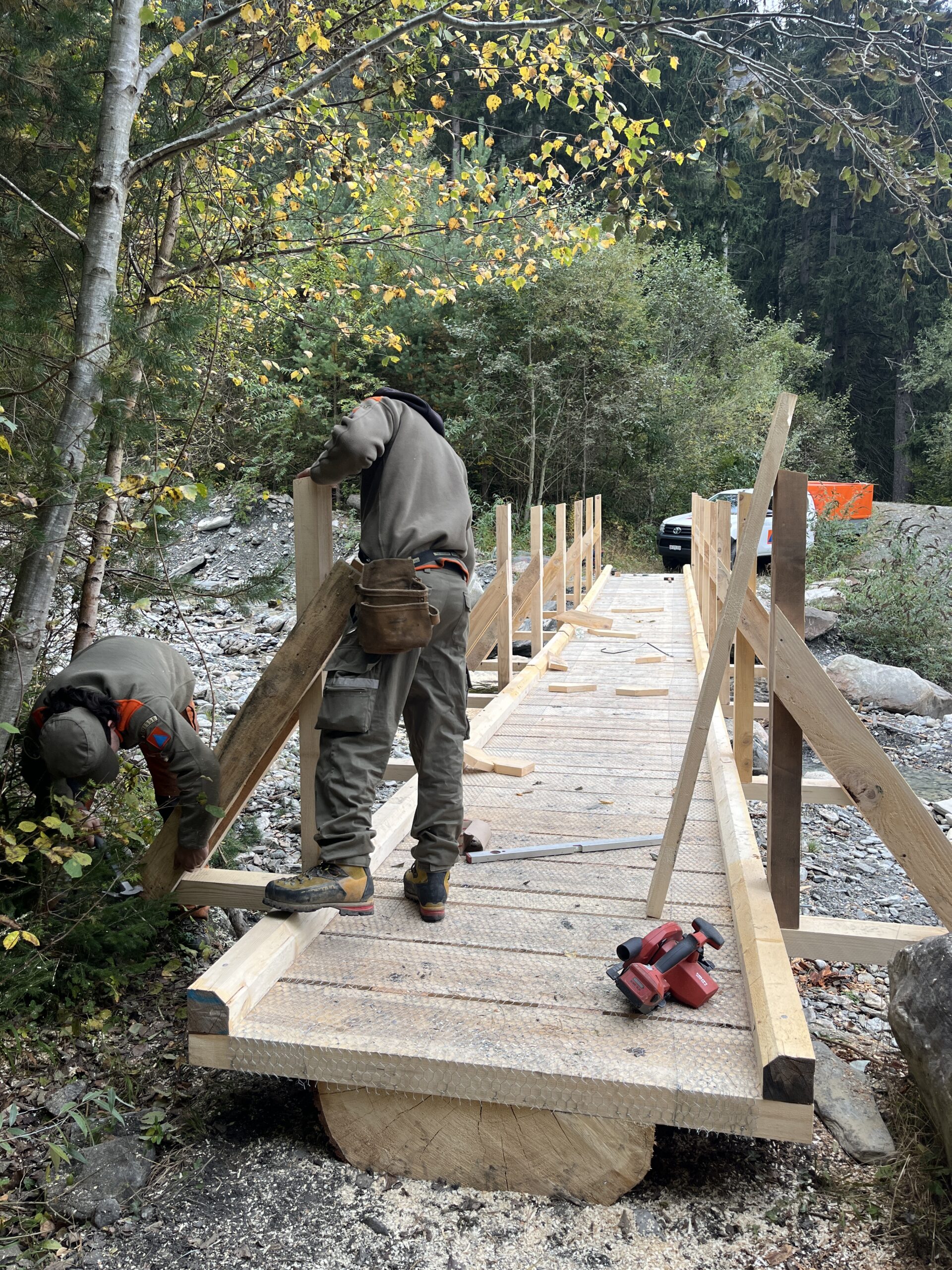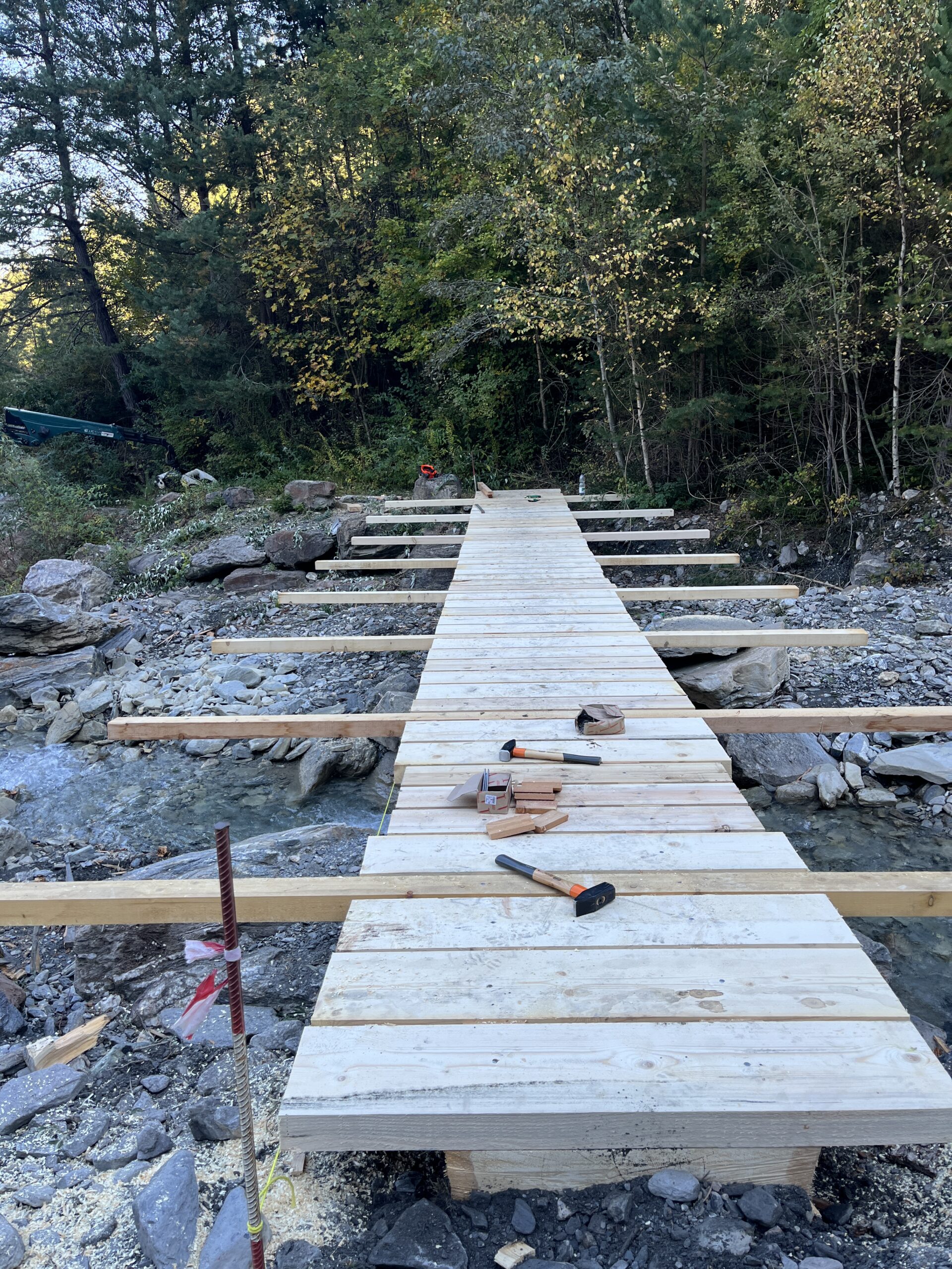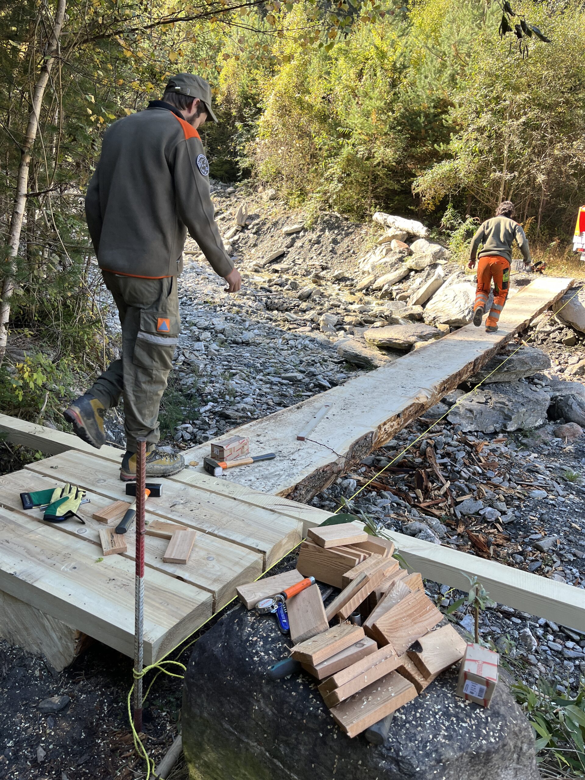 Zunächst wurde die alte Brücke fachgerecht demontiert, um Platz für die neue, stabile Konstruktion zu schaffen. Anschliessend erfolgte die Montage der neuen Brücke – eine präzise Arbeit, die gutes Teamwork und handwerkliches Geschick erforderte.