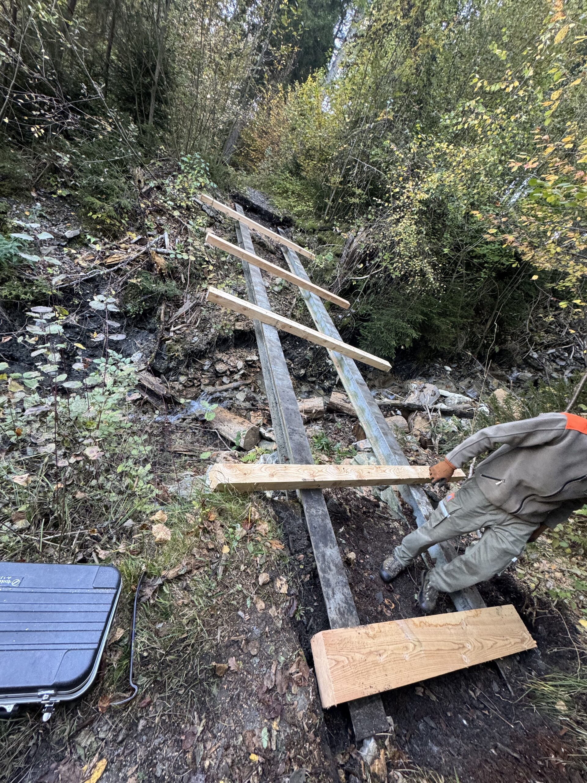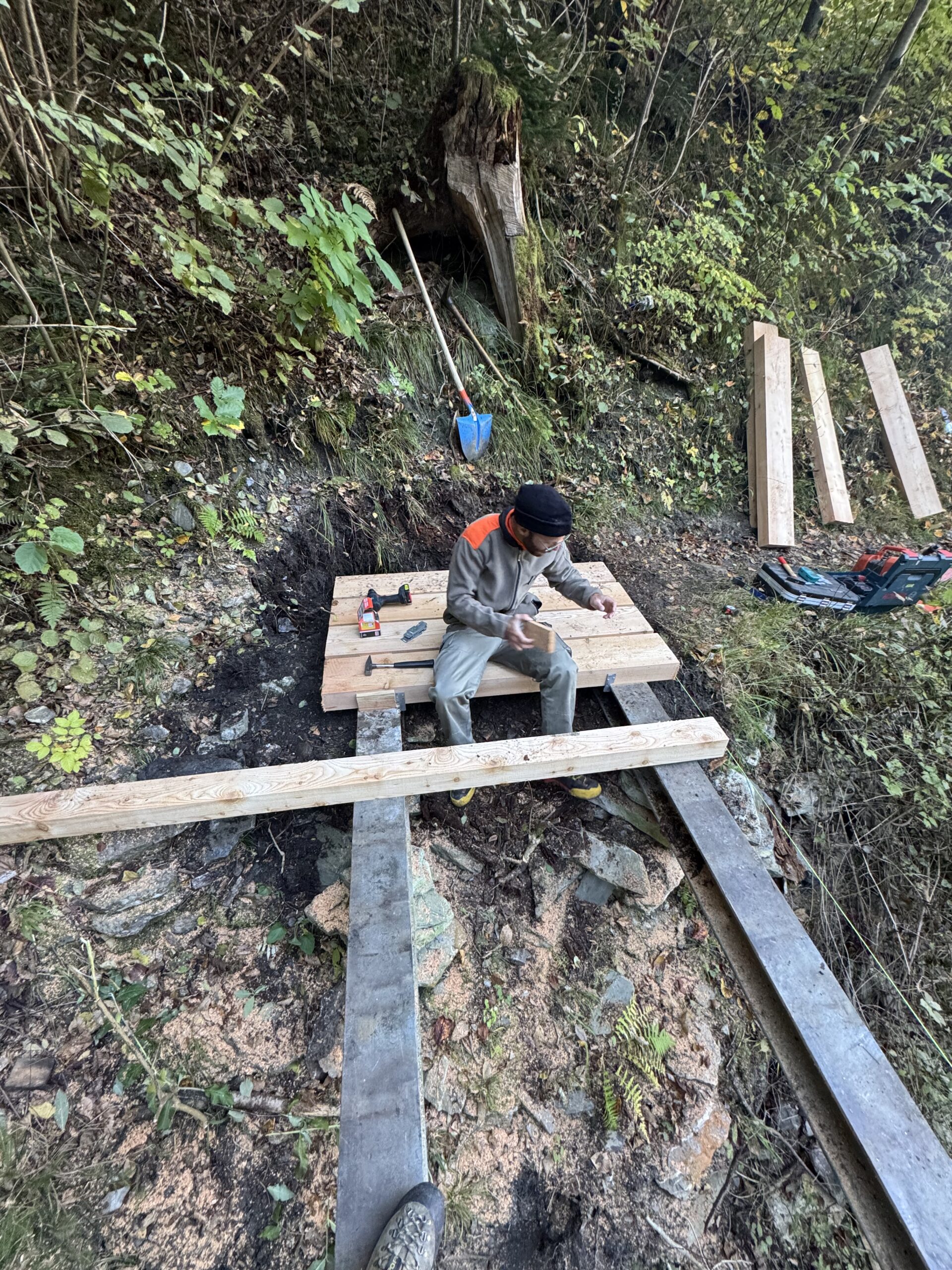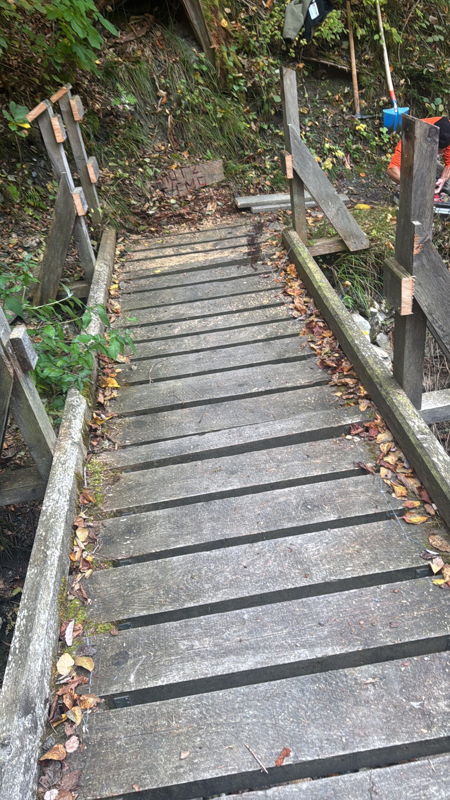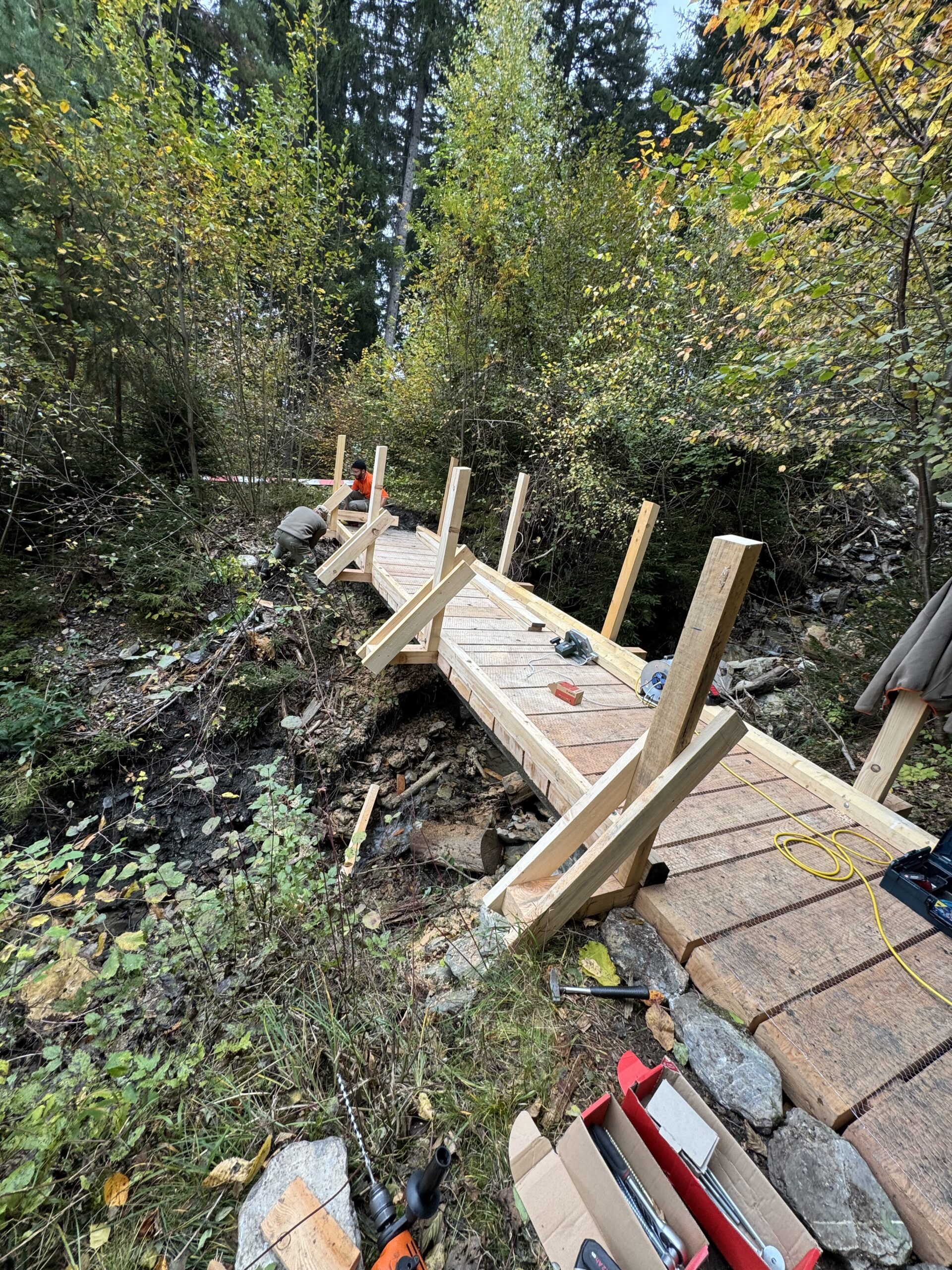 Die Arbeiten umfassten das Ersetzen beschädigter Holzteile sowie die Stabilisierung der gesamten Brücke, um die sichere Überquerung weiterhin zu gewährleisten. Durch den gezielten Einsatz von regionalem Holz konnte die Brücke nicht nur funktional, sondern auch im Einklang mit der natürlichen Umgebung saniert werden.